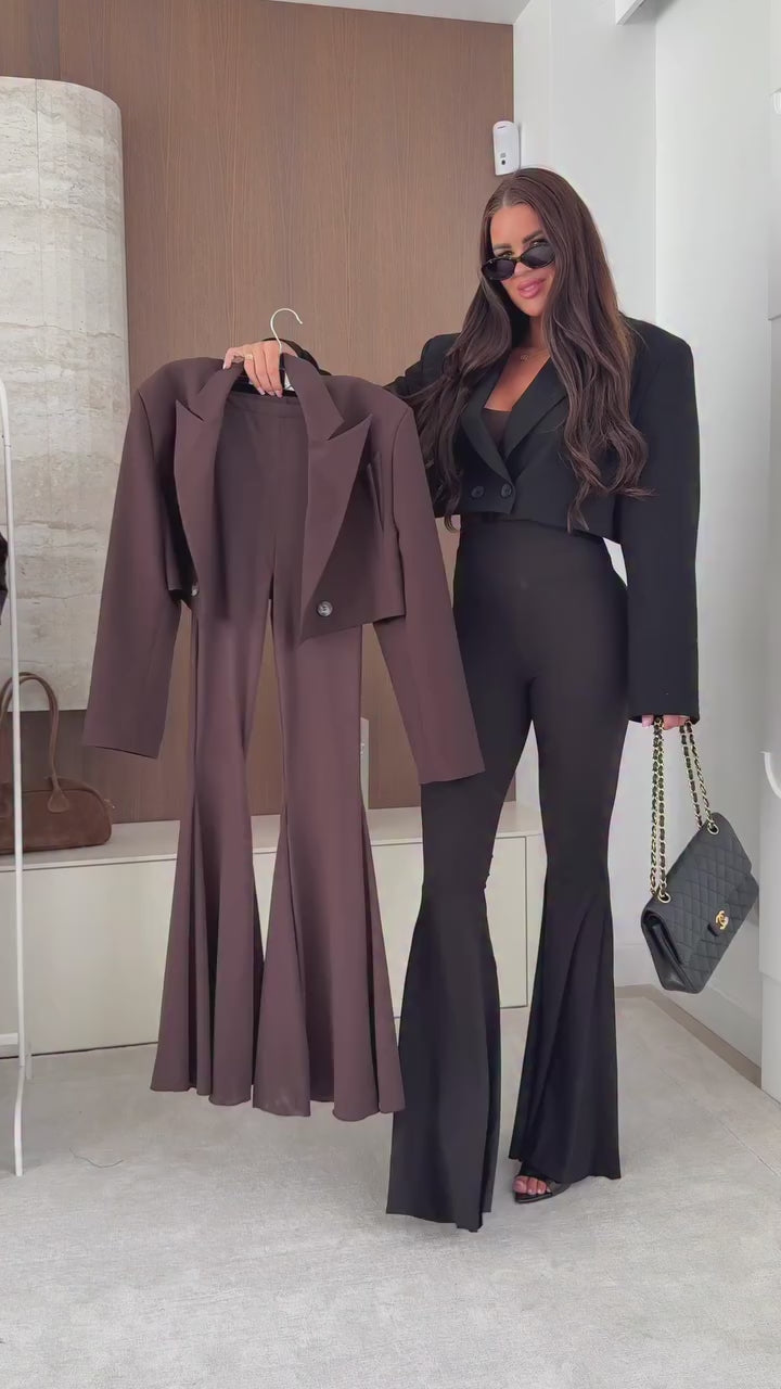 Il coordinato Back è composto da pantaloni a zampa e una giacca corta abbinata. È perfetto per un look alla moda e moderno. I pantaloni slanciano la figura e la giacca aggiunge un tocco di stile femminile. Puoi indossarli insieme o separati per creare outfit diversi. Il tessuto è di ottima qualità e comodo da indossare.